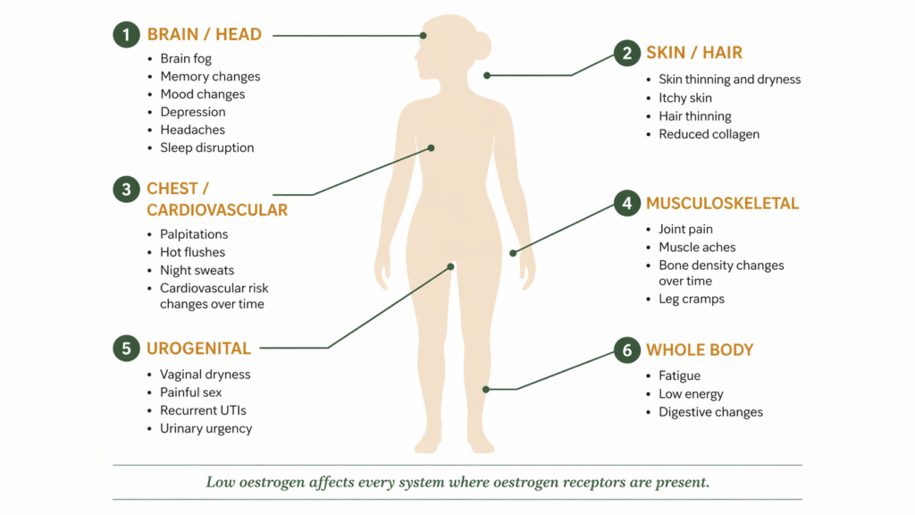 These symptoms look unrelated. They are not. They are predictable consequences of oestrogen decline across multiple body systems, because oestrogen receptors are present throughout the body and when oestrogen falls, the tissues that depend on it respond.