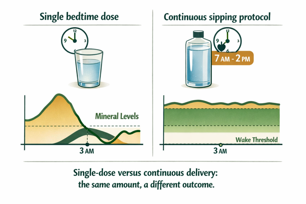 Take it 30 minutes before bed | A continuous morning sipping protocol builds the ionic mineral reserve that determines your starting point for overnight depletion. A bedtime dose alone addresses the symptom, not the cause |