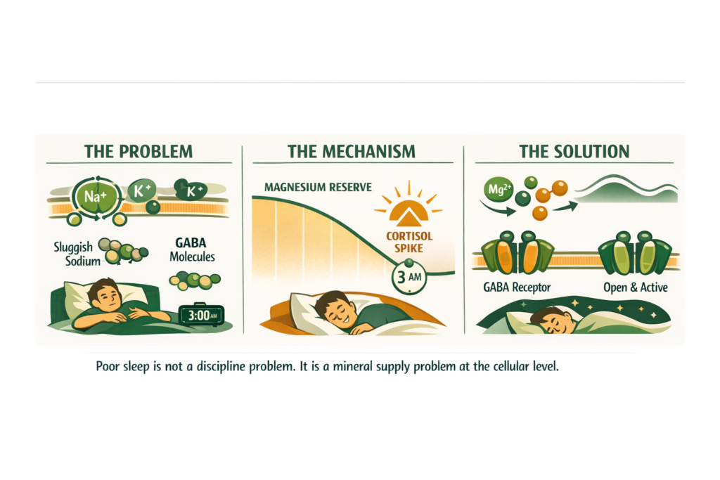 The overnight mineral depletion cycle explains why so many people wake feeling unrefreshed despite hours in bed. The pump ran on depleted reserves all night. The maintenance processes were incomplete. The nervous system never fully downshifted. Sleep happened, but not the quality of sleep the biology was capable of producing.