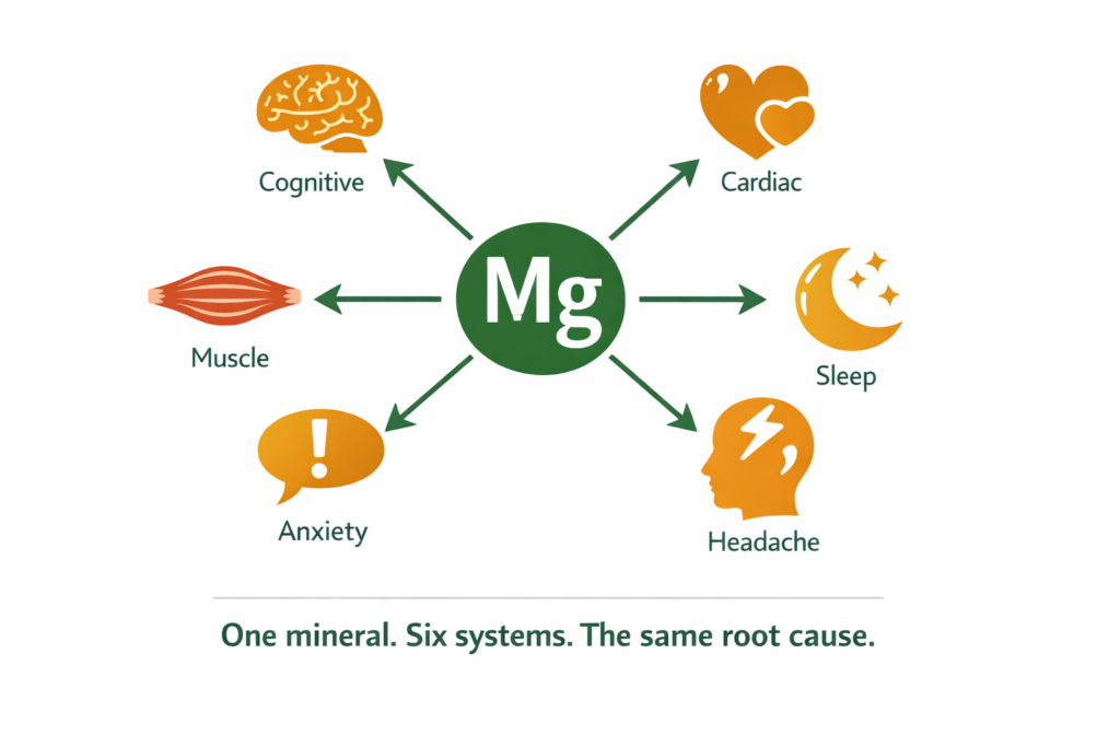 These look like separate problems. They are not. They are one mineral running low in a body that depends on it for over 300 biological processes simultaneously. When magnesium drops below the level those processes require, every system that depends on it shows a symptom at the same time.