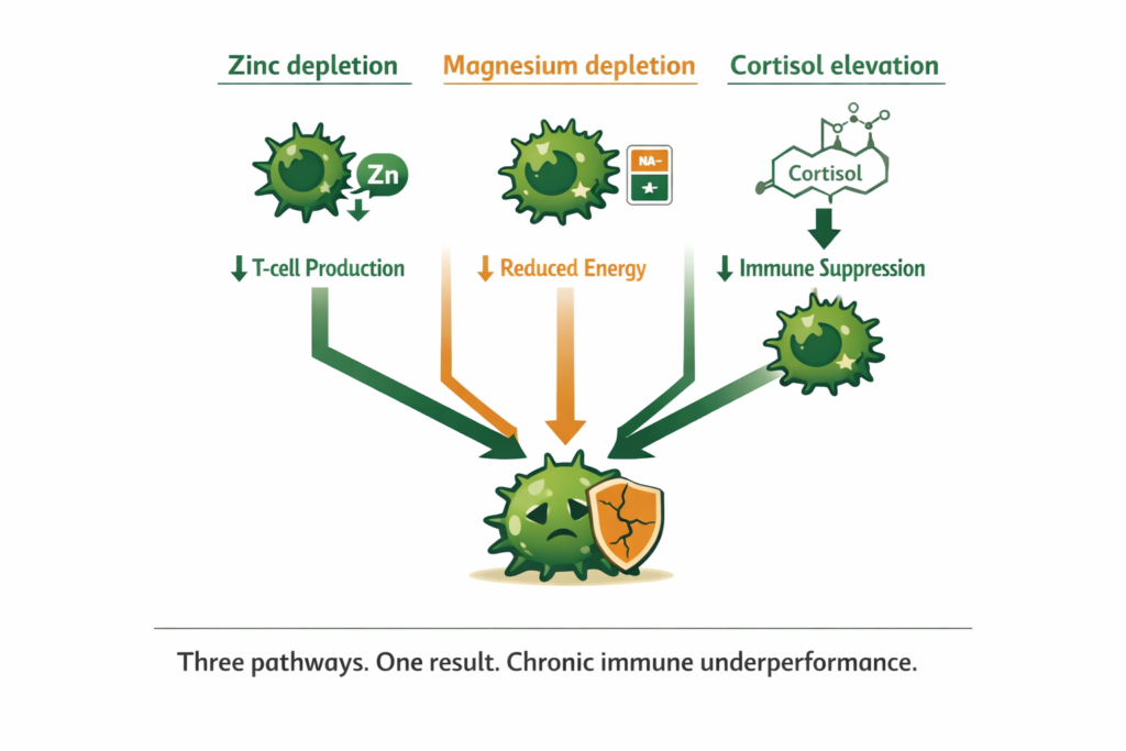 Our research indicates the most common driver of this chronic low-grade immune underperformance is not a lack of vitamin C or echinacea. It is a specific mineral deficit in the zinc and magnesium supply that immune cells require to produce, activate, and sustain an effective response. The mechanism is precise. The solution is specific. And neither looks like what most immune supplements are selling.