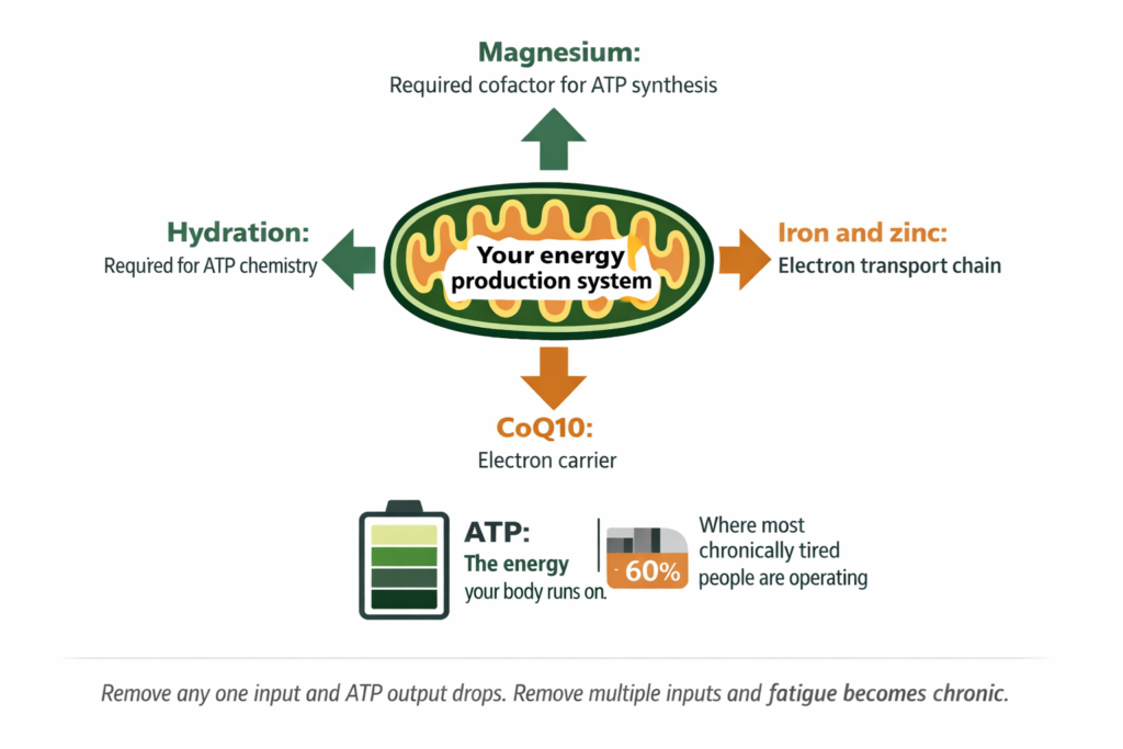 Iron is required for the electron transport chain. Zinc supports mitochondrial enzyme function. These are inputs the system cannot operate without, and they are not reliably reflected in standard serum tests.